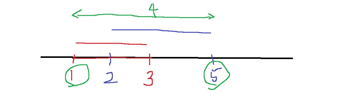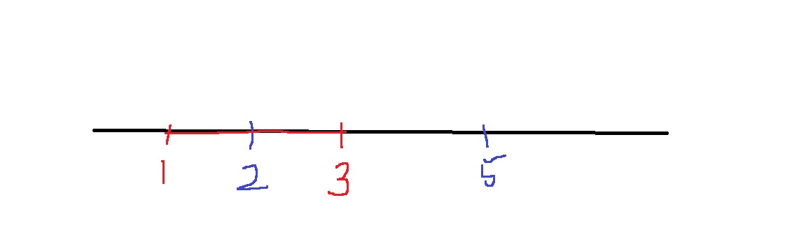 가장 왼쪽의 좌표는 1이고 가장 오른쪽의 좌표는 5이라서, 두 구간을 합치면 (1,5)가 된다.
