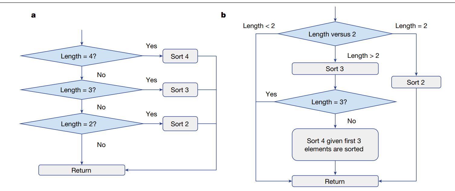 그림 a는 받은 배열의 길이가 길이 4, 길이 3, 길이 2에 따라 각각의 정렬 알고리즘을 수행한 기존의 인간이 최적화한 알고리즘인데