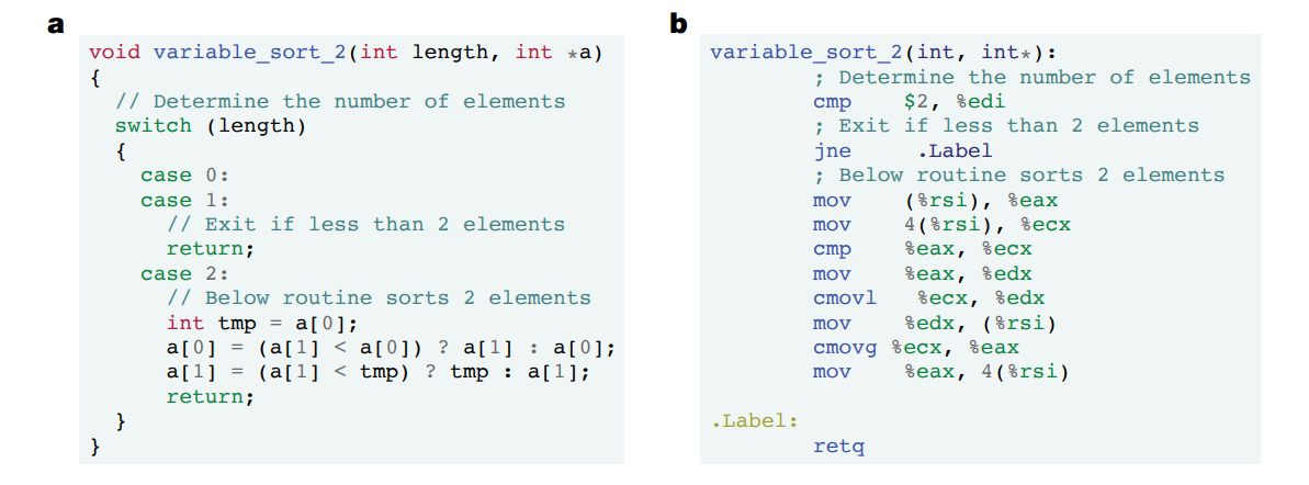 AlphaDev는 그림 c의 수도코드를 찾아냈다.