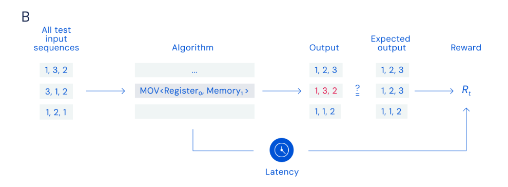 알고리즘이 한 번에 하나의 명령어로 빌드되면, AlphaDev는 알고리즘의 출력을 예상 결과와 비교하여 올바른지 확인한다.