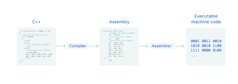 개발자는 고급 언어라고 하는 C++같은 코딩 언어로 작성하지만, 컴퓨터가 이해할 수 있도록 "저수준" 어셈블리 언어로 변환해야한다.