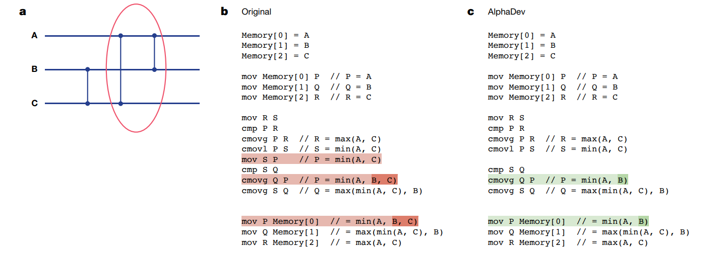 AlphaDev는 그림 c의 수도코드를 찾아냈다.