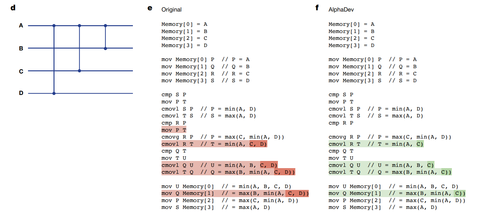 하지만 AlphaDev는 max(B,min(A,C))만 사용해도 된다는 것을 발견하여 한줄의 명령(mov P T)를 덜 처리하게 된다