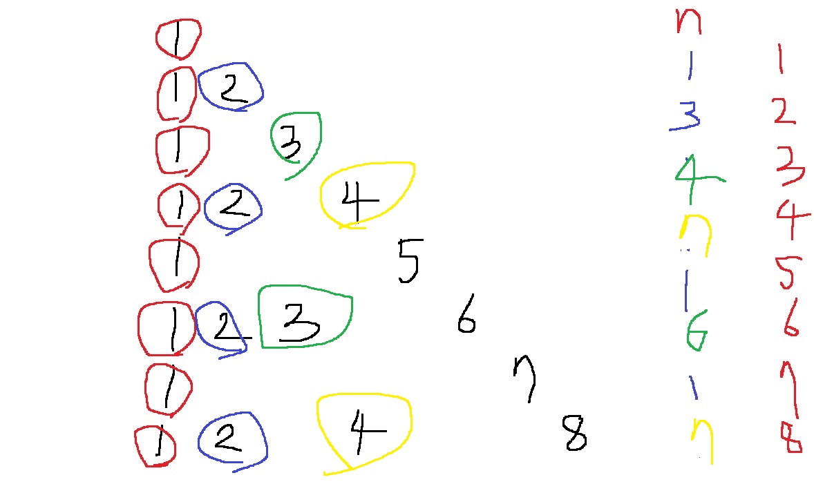 1은 8개 2는 4개 3은 2개 4는 2개 5는 1개 6은 1개 7은 1개 8은 1개