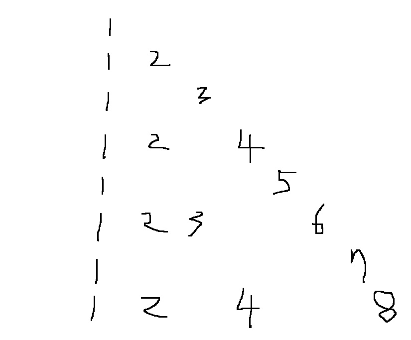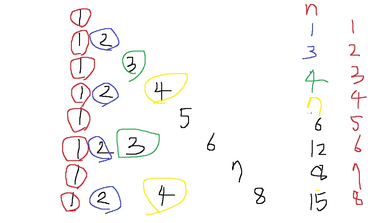 n = 8이라 한다면 1+3+4+7+6+12+8+15 = 56이 구해져야한다는 소리
