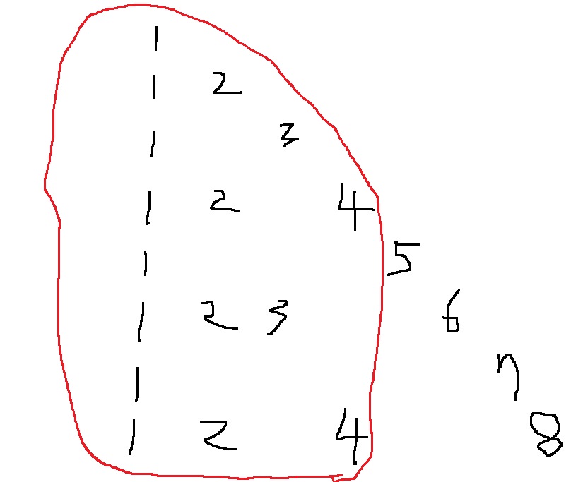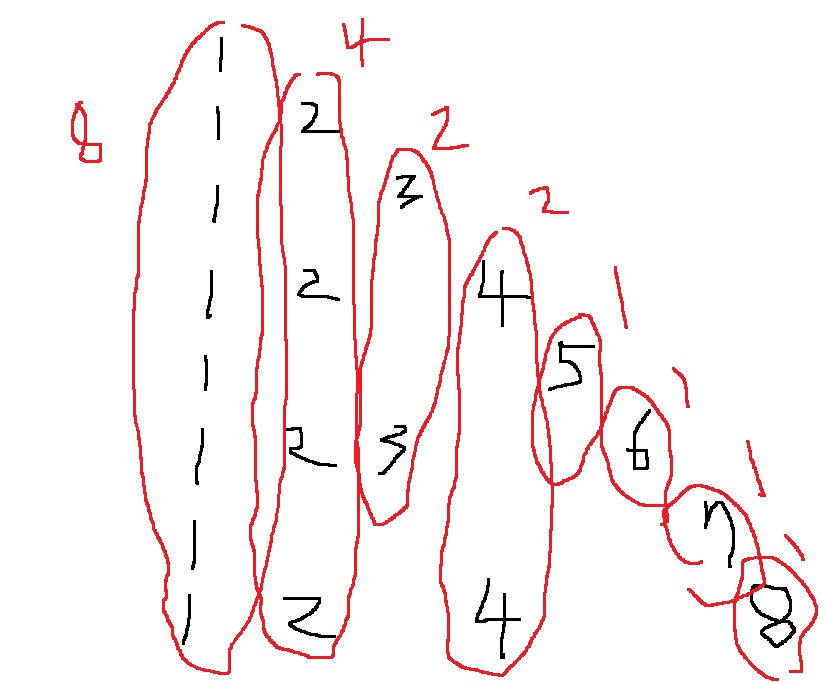 2는 몇개 있을까? n//2개 있다. 실제로 8을 2로 나눈 몫이 4라서 2가 4개 있다