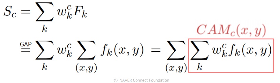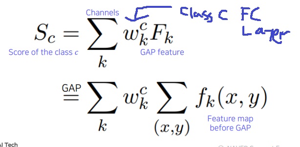 $w_{k}^{c}$는 각 채널 k의 feature map이 class c를 판단하는데 얼마나 영향을 미치는지 가중치라고 볼 수 있다