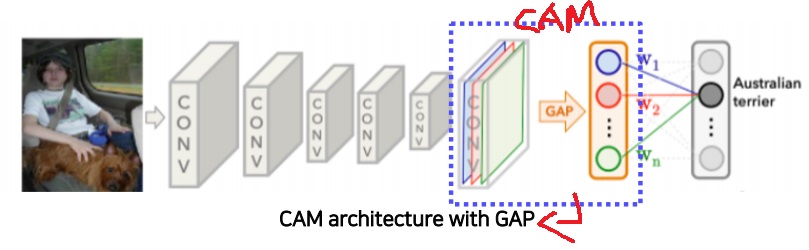 global average pooling(gap)을 통과시키고 fully connected layer를 통과시켜 task를 하는 부분을 CAM 구조라고 한다