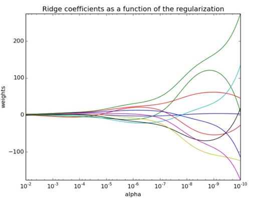 아래 두 그림의 x축은 전부 regularization의 정도인 $\lambda$를 의미하는데 클수록 regularization에 더욱 집중하여 가중치를 작게 만든다