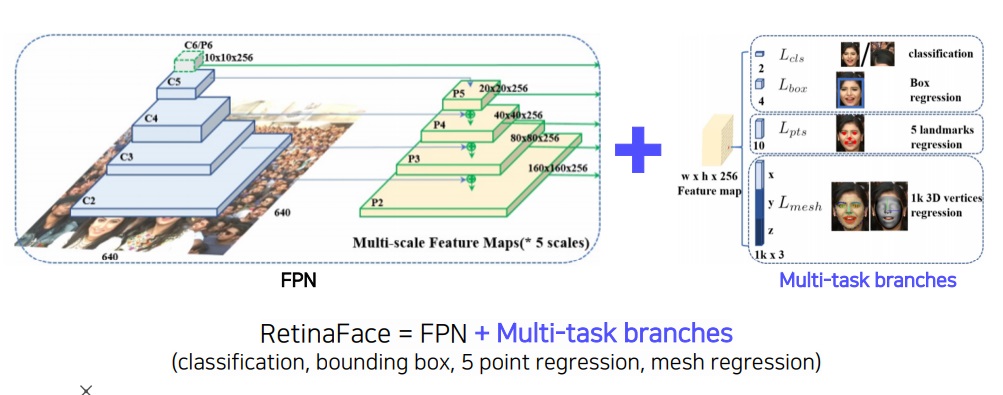 classification, bounding box detection, landmark point regression, mesh regression 등 다양한 task의 branch를 모두 결합하여 이들을 한번에 풀게 만들었다