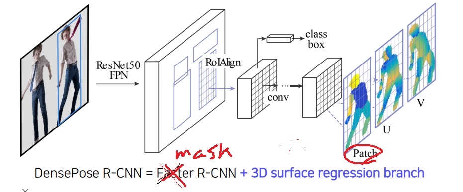 DensePose R-CNN은 Mask R-CNN에 U,V 좌표를 추정하는 branch를 결합한 형태