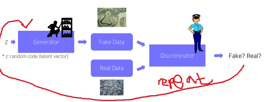 generator는 discriminator가 구별하지 못하도록 더욱 정교한 fake data를 만들면서 성능을 높여가고