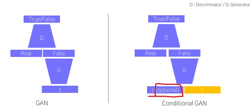 기존의 GAN은 단순히 Z라는 latent vector만 넣었다면 conditional GAN은 조건 condition을 함께(혹은 혼자만) input으로 넣어주었다