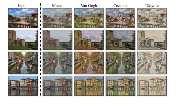 다음은 input image를 Van Gogh, Monet 스타일 등으로 바꾼 예시