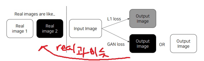 GAN loss를 사용하면 discriminator가 회색 이미지를 잘 판별하므로 generator는 더욱 정교한 이미지 생성을 위해 black이나 white를 생성한다.