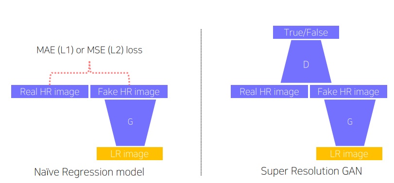 그래서 단순한 회귀 모형을 사용하면 해상도를 높여주더라도 real image와는 거리가 먼 blurry한 이미지를 출력해서 좋지않았다.