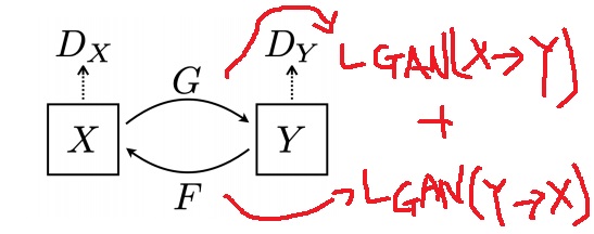 반대방향으로 Y에서 F가 X를 생성하고 $D_{x}$가 생성한 것이 진짜 X 스타일에 부합한지 판별하는 $L_{GAN}(Y -> X)$