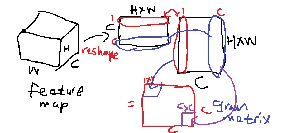 이렇게 하면 i채널과 j채널의 유사도를 (i,j)원소로 가지는 gram matrix가 구해진다.