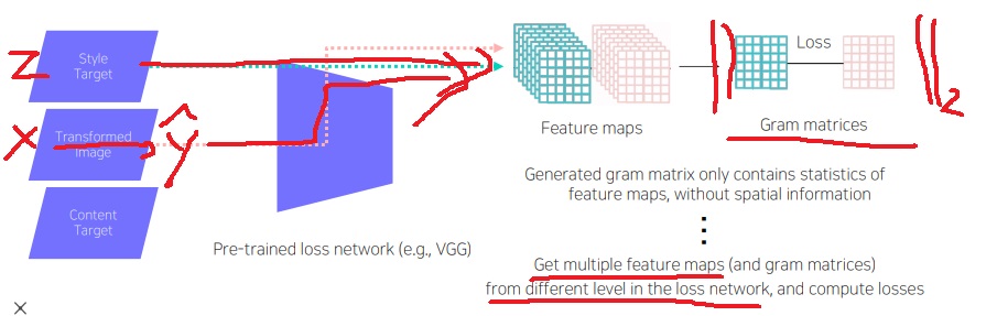 1.2, 2.2, 3.3, 4.3 layer 4군데에서 계산한 style target의 feature map과 transform image feature map 각각의 gram matrix를 이용한 L2 loss로 style reconstruction loss 계산