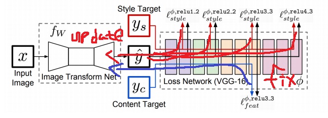 이들의 backpropagation으로 image transform net이 학습되는 구조