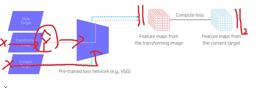 image transform net에 의한 output과 스타일이 바뀌지 않은 원본 이미지 X를 content target으로 loss network에 넣어줌