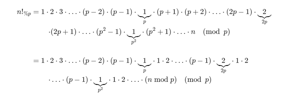 즉 n!에서 p를 모두 제거하면 (p-1)!이 반복되어져서 곱해지다가, 마지막에 (n mod p)!이 곱해지는 형태로 나타낼 수 있다.