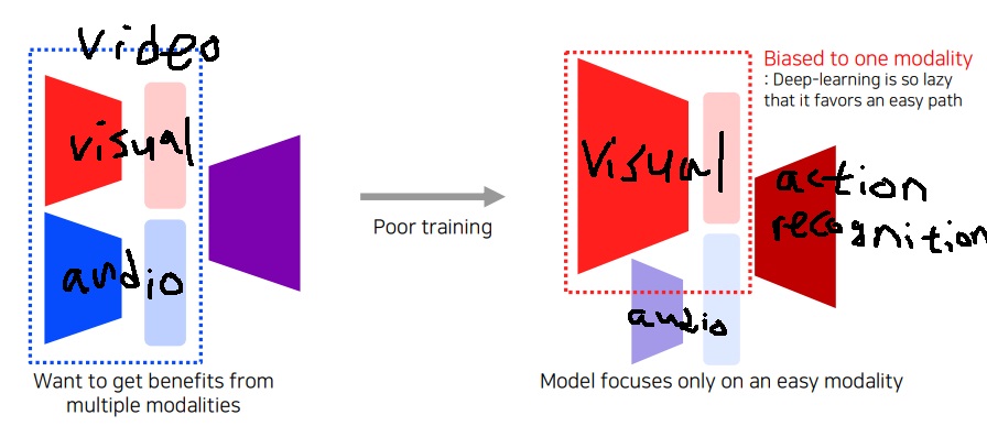 Neural network는 일반적으로 visual 정보만 많이 사용하여 visual과 audio가 같이 들어오면 visual에 편향되어 학습되는 경향이 있다.