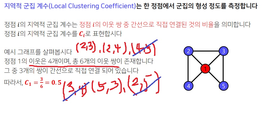 사실 이 때문에 연결성이 0,1인 node의 local clustering coefficient를 0으로 정의하는 경우가 있다는 것이 합리적이다.