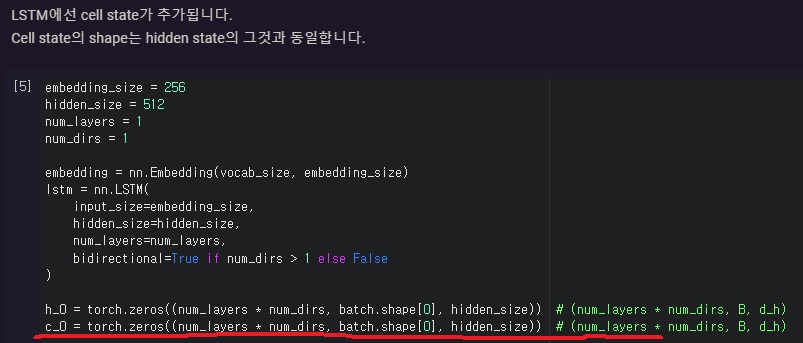 lstm의 경우 hidden vector h0뿐만 아니라 cell state vector도 첫 벡터 C0를 0으로 초기화해서 넣는다