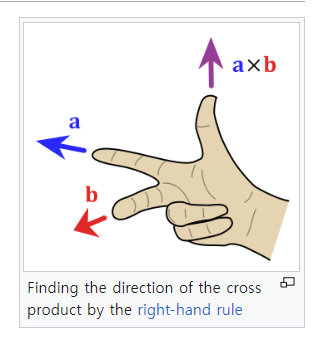 두 벡터 a,b가 주어질때, 외적의 방향은 오른손 법칙을 이용해 알아낼 수 있다