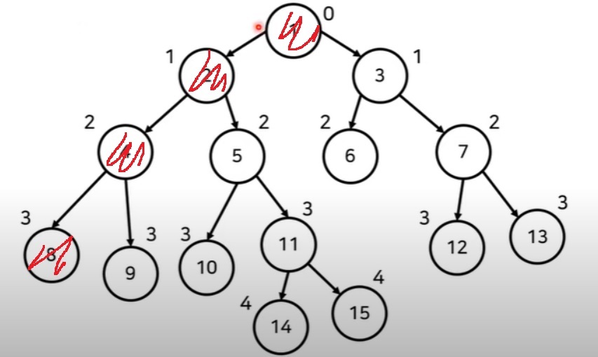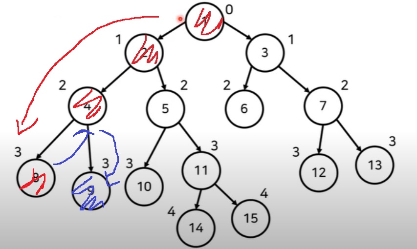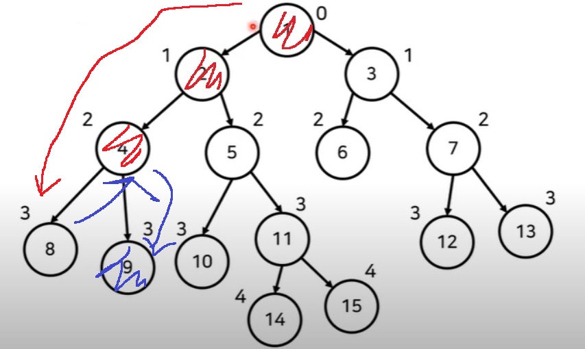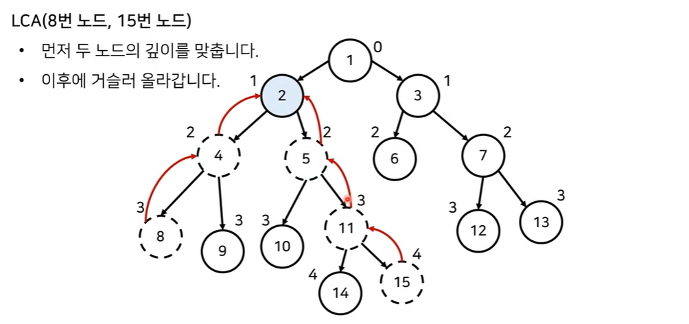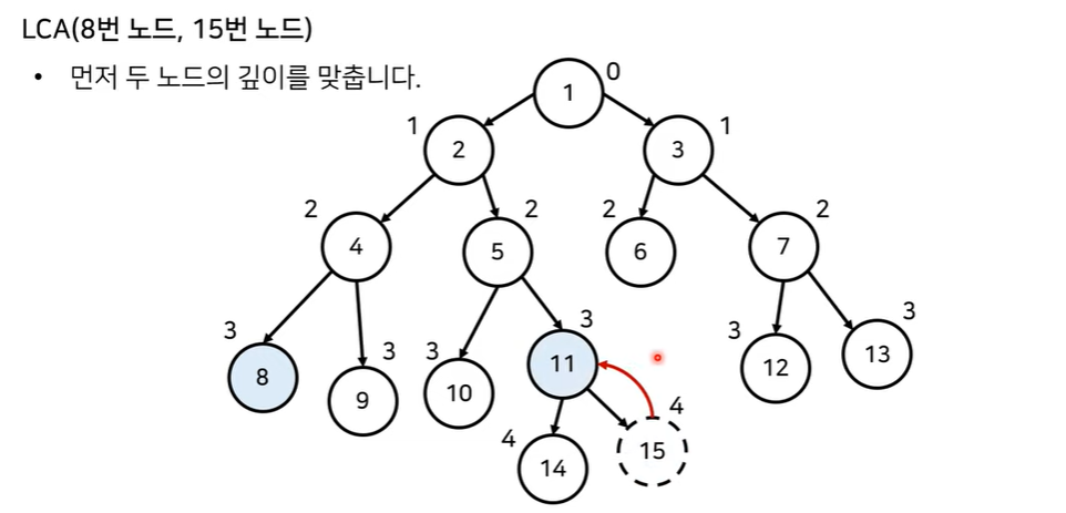 2) 예를 들어, 8번 노드와 15번 노드의 최소 공통 조상을 찾고 싶다면,
