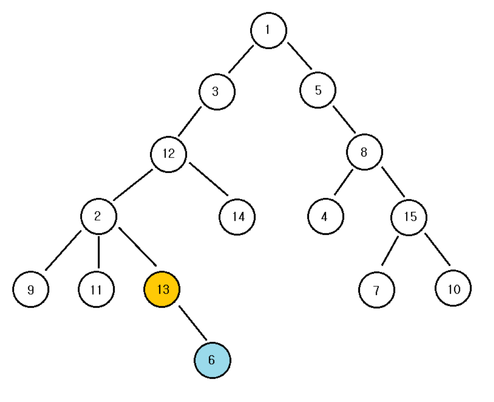 즉 다음과 같은 경우, 6과 13의 최소 공통 조상은 13이다.