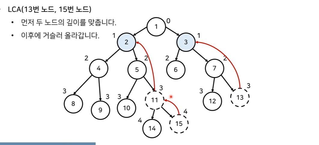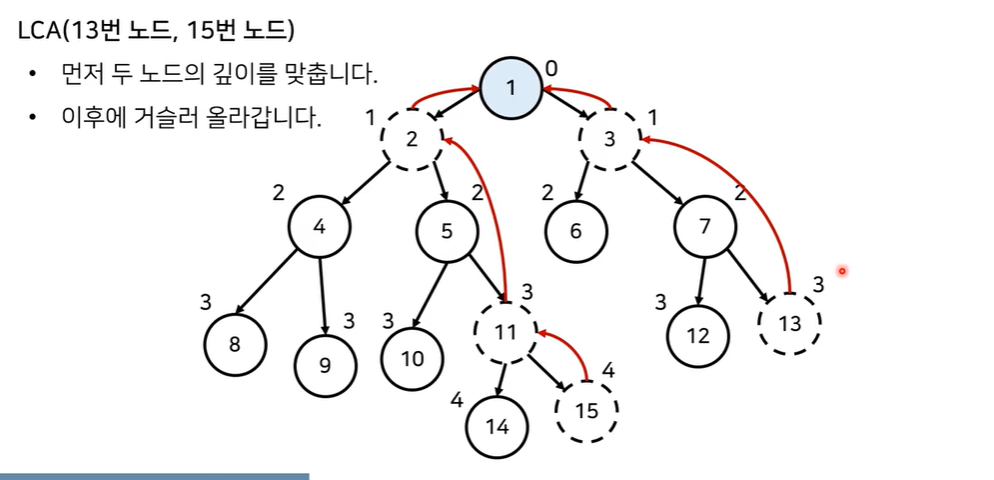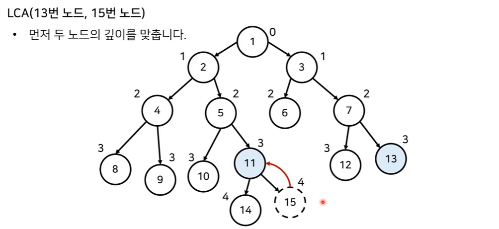 다음 그래프에서 13번 노드와 15번 노드의 최소 공통 조상을 찾는다면..?