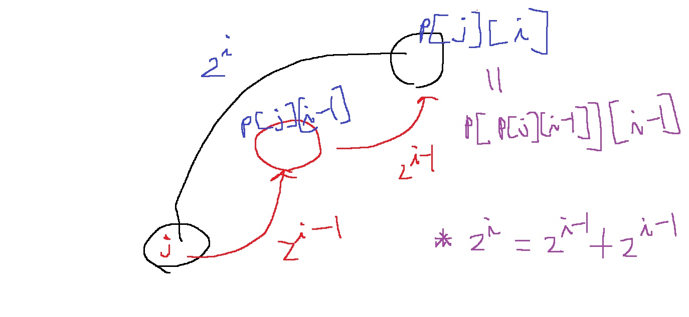 j에서 $2^{i}$까지 거슬러 올라가는 것은 j에서 $2^{i-1}$만큼 올라가고, 거기서 $2^{i-1}$만큼 올라간 것과 같다.