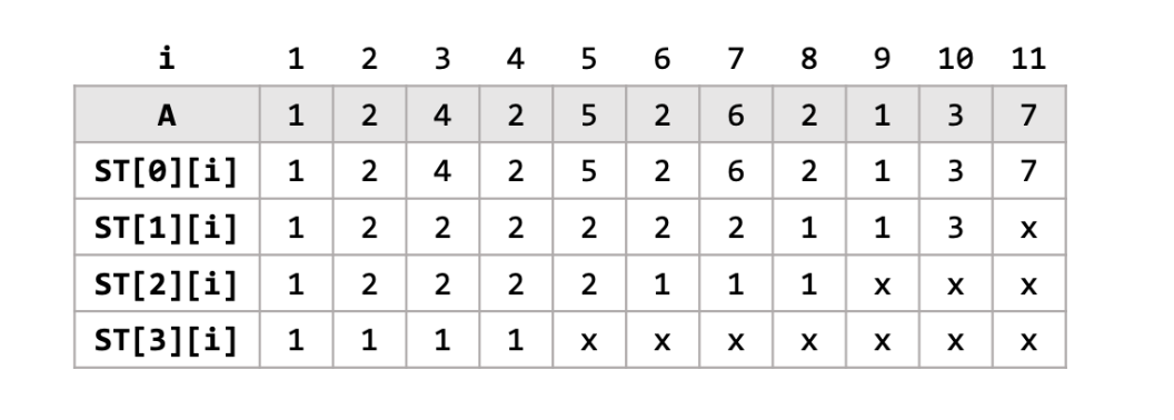 구체적으로 range minimum query는 st[i][j] = min(A[j], A[j+1], ... , A[j+$2^{i}$-1])으로 j부터 연속한 $2^{i}$개의 원소들의 최솟값을 저장한다.