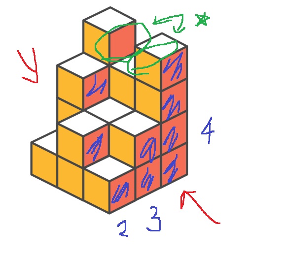 위,아래, 앞,뒤,왼쪽,오른쪽에서 보이는 면의 개수를 전부 더하면 될 것이며