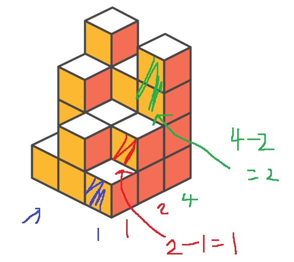오른쪽에서 볼때, 3행에서 3열 원소, 2열 원소, 1열 원소로 순회해가는데 처음에 4개가 보여서 4를 더하고,
