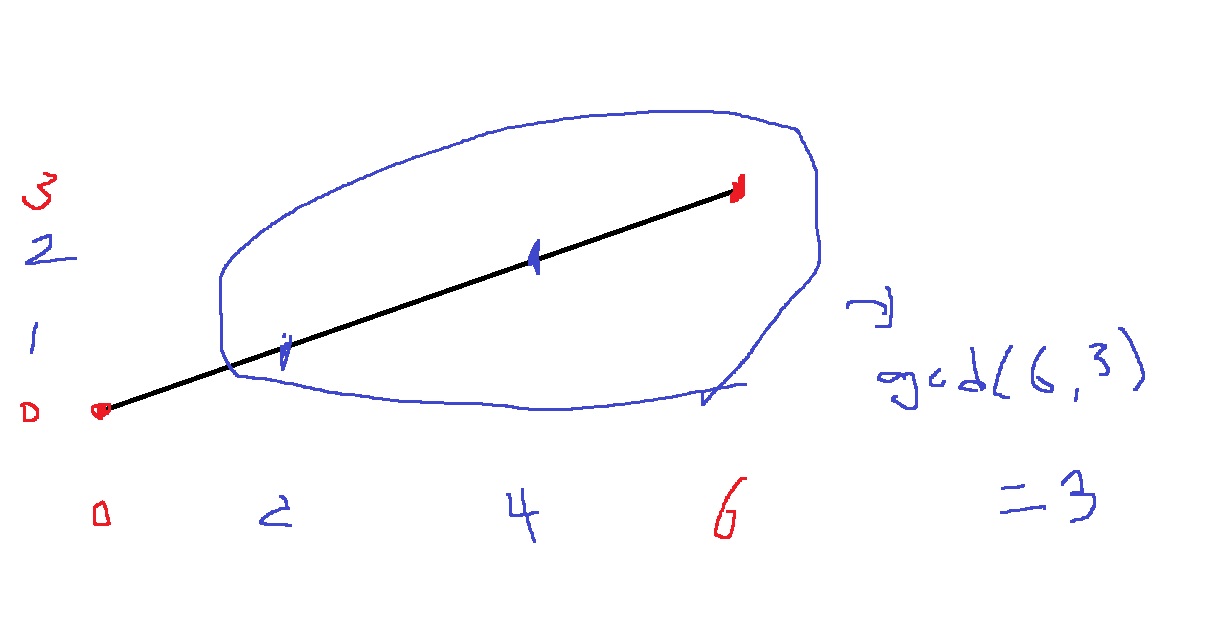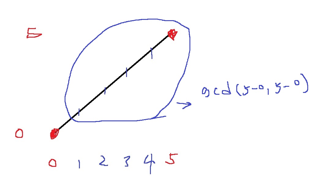 위와 같이 (0,0)과 (5,5)가 주어졌을때 (5-0), (5-0)은 5,5이고 최대공약수는 5이다.