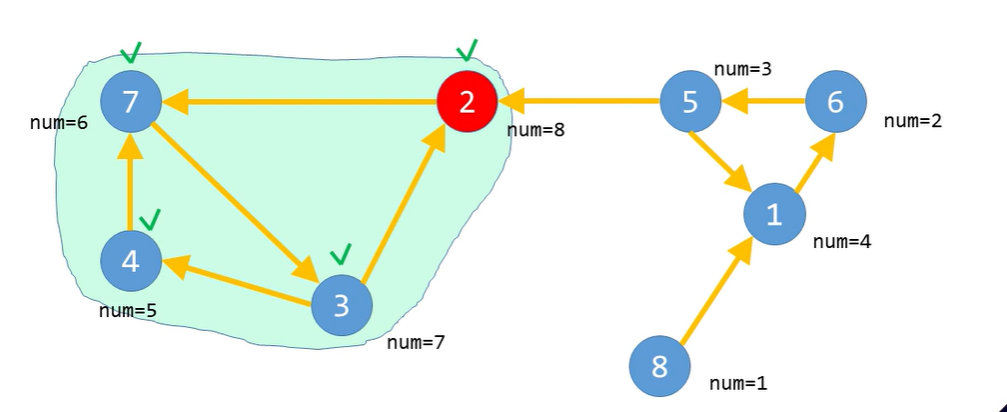 그러면 2번, 7번, 3번, 4번을 차례대로 방문하면서.. 이들이 하나의 강한 연결 요소가 된다.