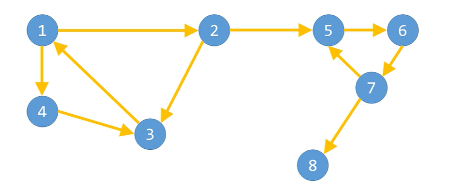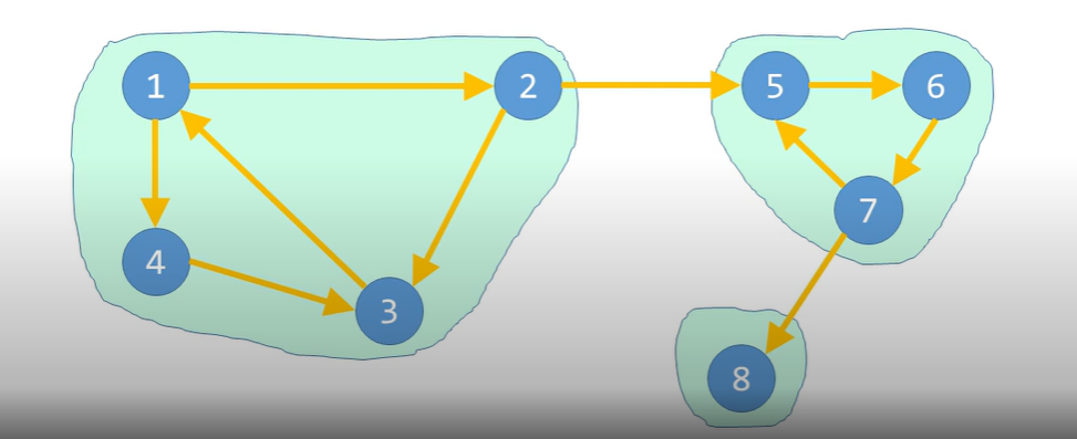 하지만 그래프를 다음과 같이 적당히 분할하면, 분할된 그룹들 [1,2,3,4], [5,6,7], [8]은 강한 연결 요소들이 된다.