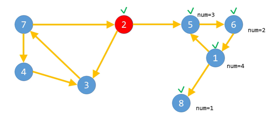 3) DFS를 수행하는 중에, 더 이상 방문할 정점이 없다면 마지막으로 방문된 정점에 num값을 저장