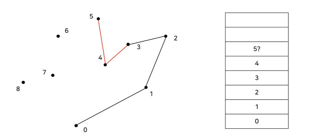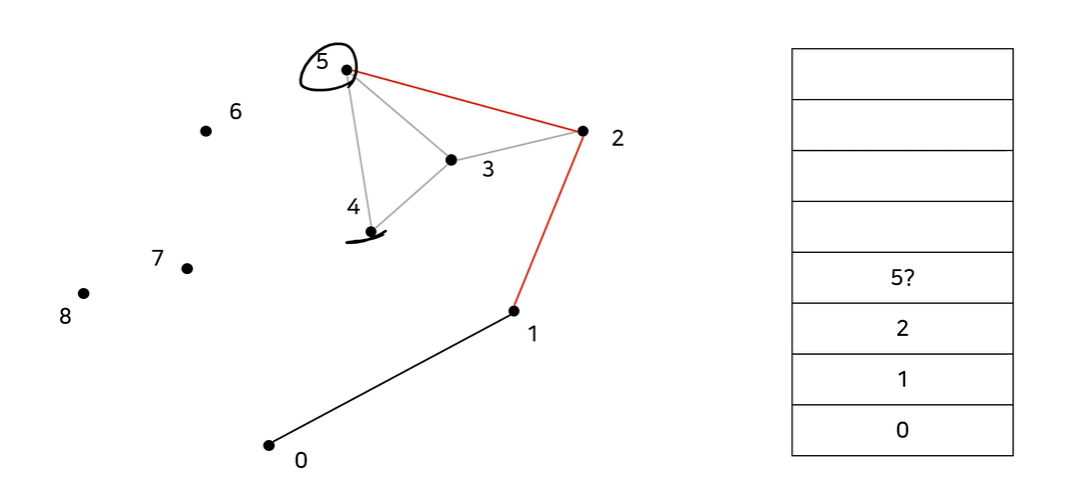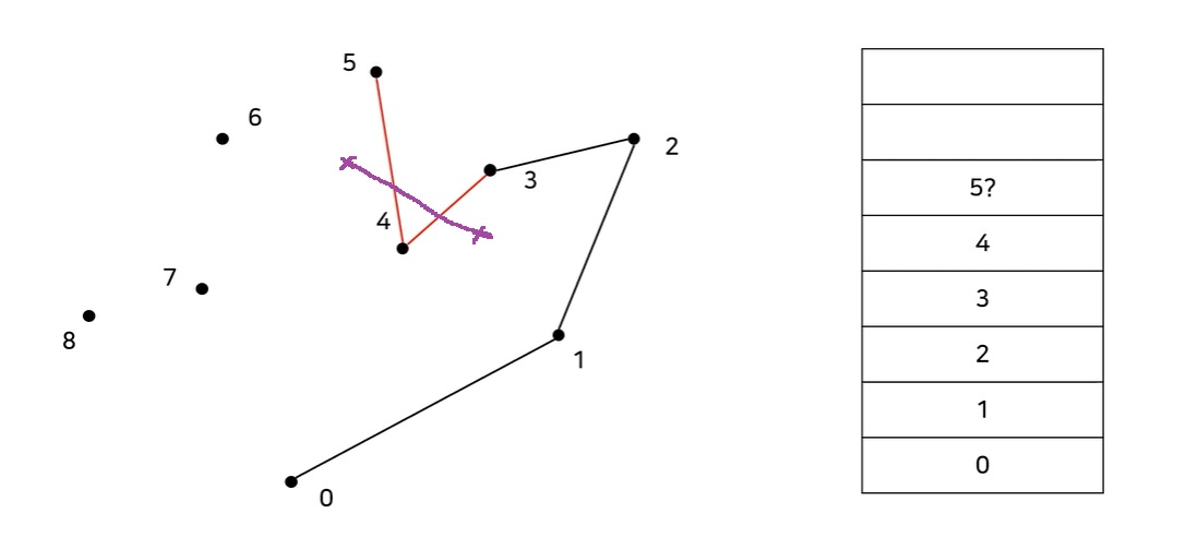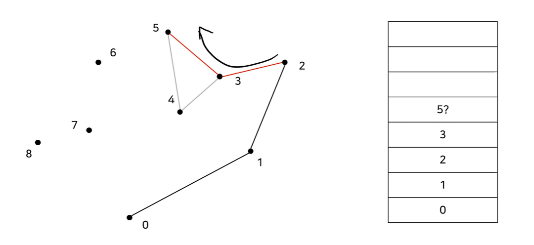 그러면 (1,2,5)는 반시계 방향을 이루기 때문에 이제는 5를 스택에 집어넣을 수 있다.