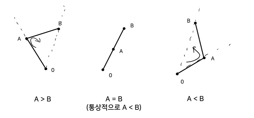 CCW가 음수여서 시계방향이면 다음 그림과 같이 A가 B보다 큰 것이고, 양수여서 반시계방향이면 B가 A보다 큰 것이다.