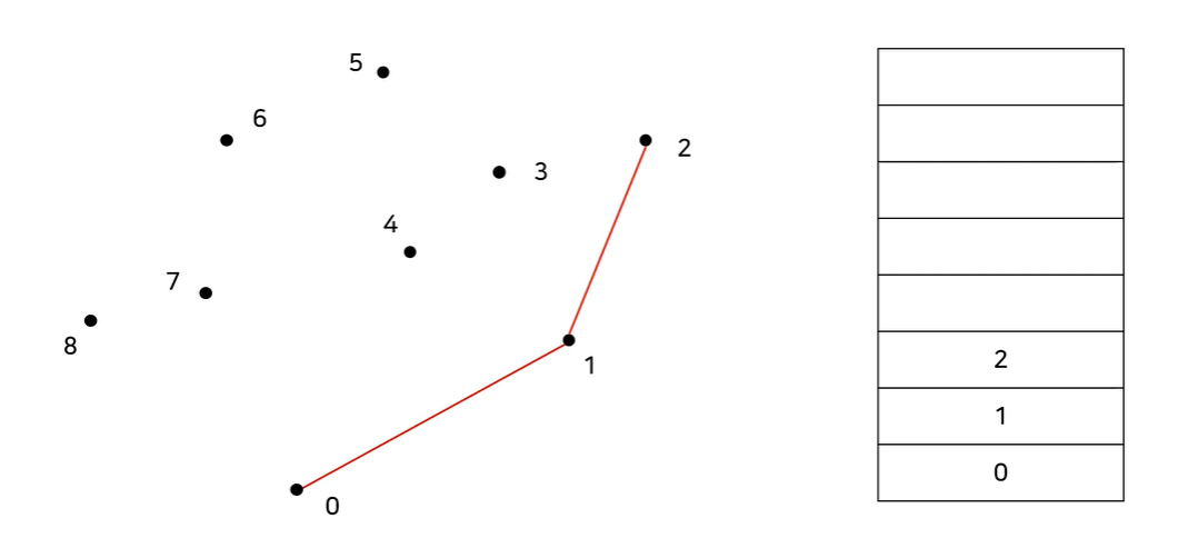 2) 순서대로 점을 보면서 스택에 차례대로 집어 넣는다.