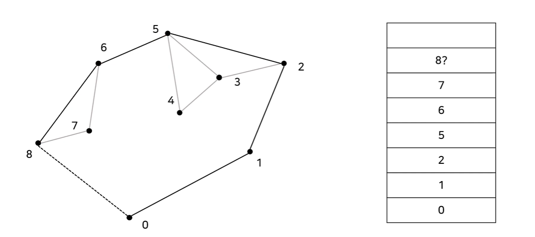이제는 8을 넣어주면 스택에 남아있는 0,1,2,5,6,8이 볼록 껍질을 이루는 점들이 된다.