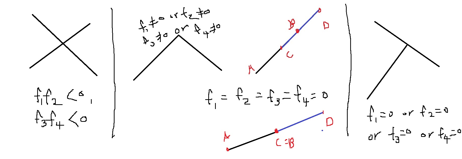 f1 = 0, f2 = 0, f3 = 0, f4 = 0인 경우는 4개의 점이 일직선 위에 있으면서 양 끝 점이 일치할 수도 있는거고..