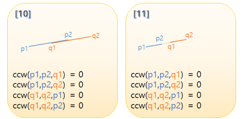 이때 2) 4개의 점이 일직선 위에 있는 경우에는.. 모든 CCW가 0이다.