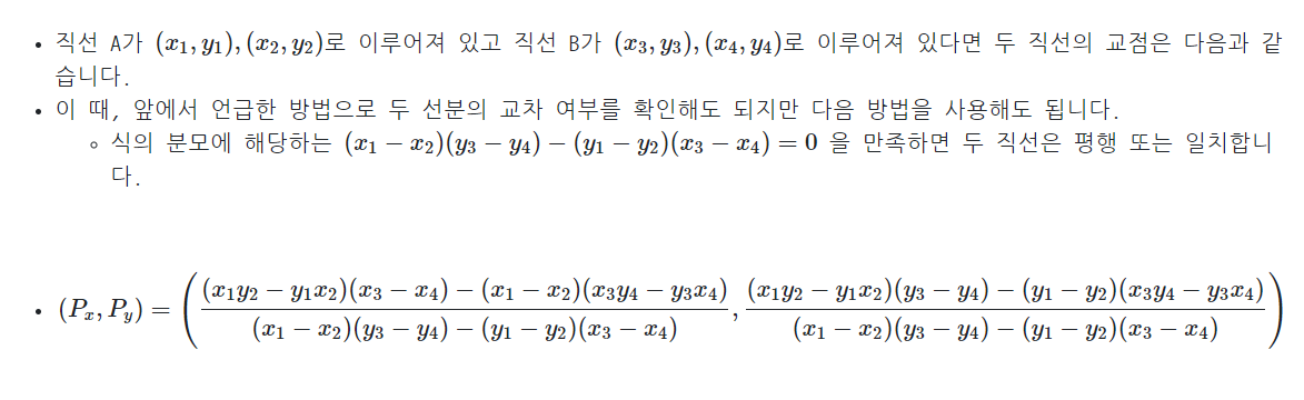 2), 3)같은 경우는 선분의 끝점에서 만나므로 따로 구할 필요 없이 선분의 끝점을 출력하면 될 것이고