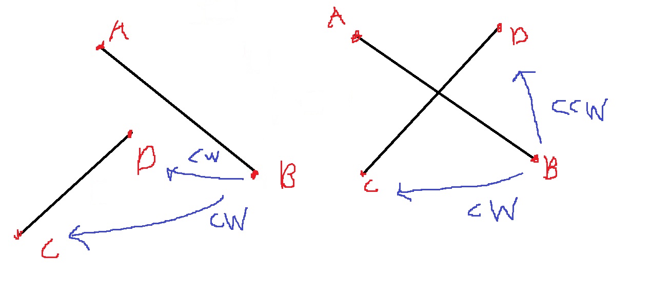 다음과 같이 교차하지 않더라도 C,D,A가 CCW를 이루고 C,D,B가 CW를 이룰 수 있다.